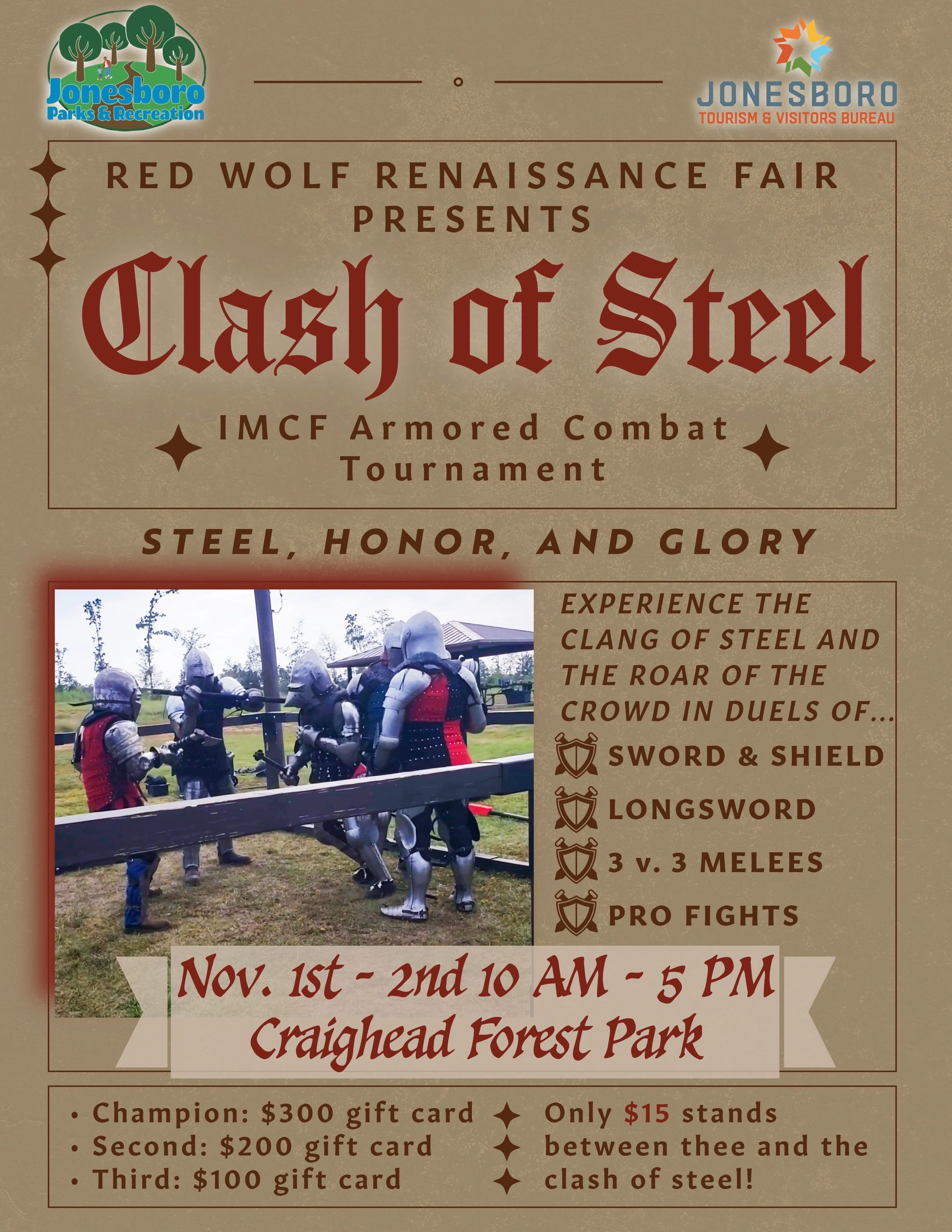Hear the clang of steel and feel the roar of the crowd! Join us for the Red Wolf Renaissance Fair's "Clash of Steel," an intense IMCF Armored Combat Tournament.